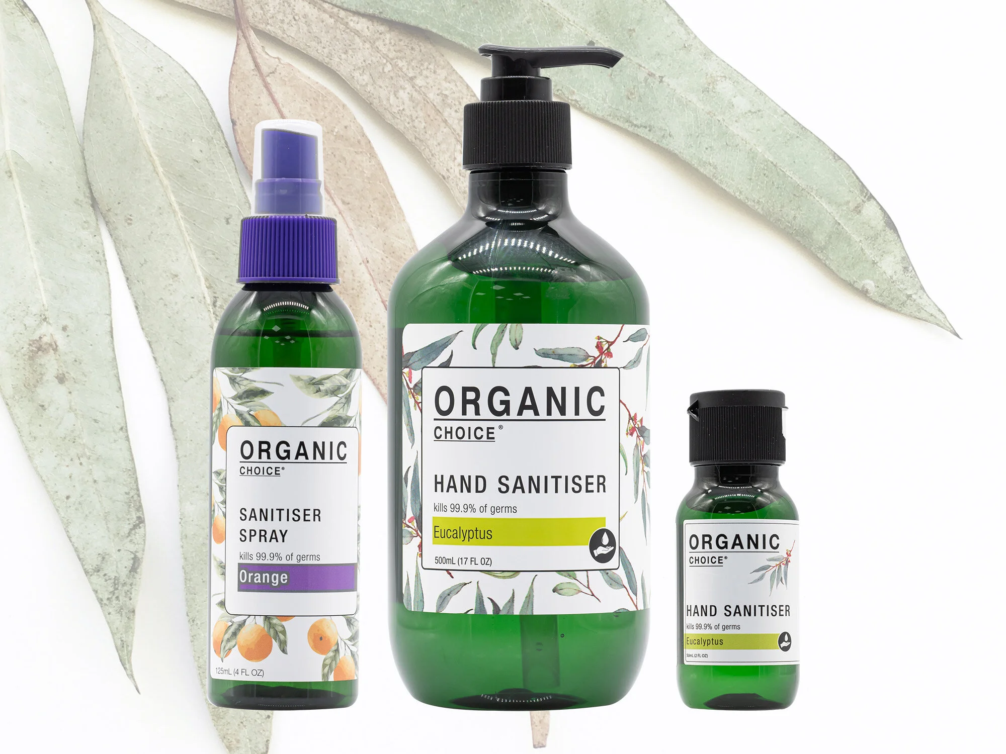 The new anti-bacterial range of products from Organic Choice are special hand santisers specifically formulated to kill 99% of germs. The hand sanitiser gel cares for the skin with the addition of Aloe Vera & you will feel fresh and clean with the added blend of aromatic essential oils from Eucalyptus. The sanitiser spray uses pure cold pressed orange oil in a sugar alcohol base to produt a highly active anti-bacterial mist.